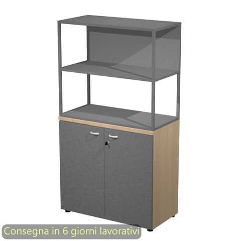 Libreria in metallo bassa con struttura antracite opaco e ripiani antracite laguna, sovrapposta ad armadio basso rovere con ante antracite. Libreria in metallo a due vani di dimensioni: 90x44xH.80 cm con struttura 20x20 mm a giorno con ripiani, base, cappello e un dietro in melaminico; sovrapposta ad un armadio basso di dimensioni: 90x44xH.85 cm completo di ante battenti con serratura. Libreria metallo completa di n°1 dietro in melaminico posizionabile a scelta nel vano superiore o in quello inferiore. Linea Blade. Dimensioni: 90x46xH.165 cm. Nel mobile basso è presente un ripiano intermedio di sp. 25 mm (nella posizione intermedia il vano superiore è alto 378 mm e quello inferiore 377 mm). Produzione interna Artexport della parte in legno certificata Iso 9001. Certificazioni FSC e PEFC. Imballi totalmente in cartone per un facile riciclo, a basso impatto ambientale.