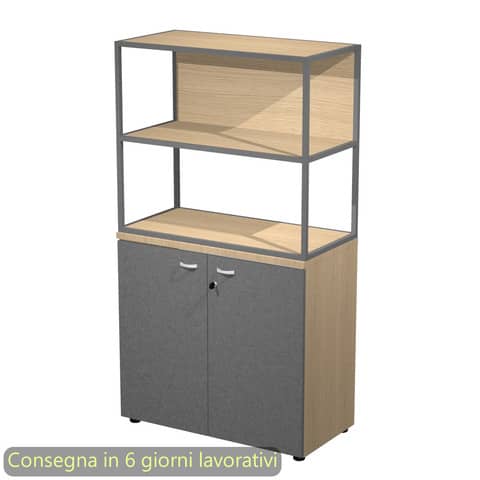 Libreria in metallo bassa con struttura antracite opaco e ripiani rovere chiaro, sovrapposta ad armadio basso rovere con ante antracite. Libreria in metallo a due vani di dimensioni: 90x44xH.80 cm con struttura 20x20 mm a giorno con ripiani, base, cappello e un dietro in melaminico; sovrapposta ad un armadio basso di dimensioni: 90x44xH.85 cm completo di ante battenti con serratura. Libreria metallo completa di n°1 dietro in melaminico posizionabile a scelta nel vano superiore o in quello inferiore. Linea Blade. Dimensioni: 90x46xH.165 cm. Nel mobile basso è presente un ripiano intermedio di sp. 25 mm (nella posizione intermedia il vano superiore è alto 378 mm e quello inferiore 377 mm). Produzione interna Artexport della parte in legno certificata Iso 9001. Certificazioni FSC e PEFC. Imballi totalmente in cartone per un facile riciclo, a basso impatto ambientale.