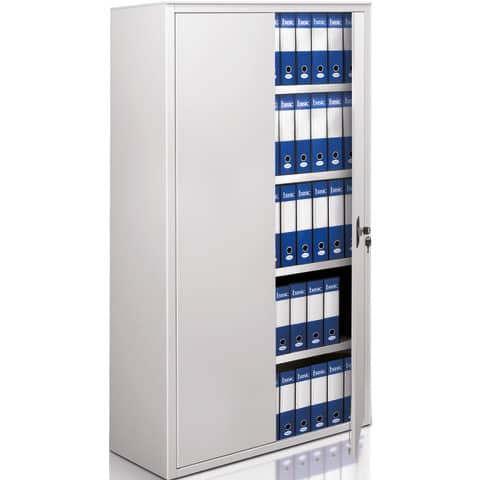Armadio archivio a porte battenti, dimensioni 100x45x200(h) cm, portata ripiano 35 kg. Armadio in robusta lamiera d'acciaio 1° scelta spessore 7-8/10°. Internamente corredato di unico vano con 4 piani regolabili predisposti per l'aggancio di cartelle sospese (di interasse 33 cm) spostabili su cremagliere/mensoline con 3 punti di aggancio. Chiusura porte mediante unica serratura a maniglia con mandata di chiusura superiore ed inferiore, con chiavi in duplice copia. Cielo sbordante con bordi arrotondati, fondi con rinforzi da 12/10. Porte con rinforzo centrale apertura a 90° e cerniere interne. Posteriore diviso a metà.