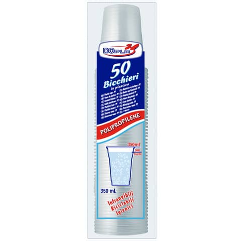 Bicchieri realizzati in polipropilene marcato. Colore neutro trasparente. Capacità: 350 ml. Diametro superiore: 80 mm. Altezza: 122 mm. Peso netto unitario: 4 grammi. Adatti al contatto con alimenti: fino a una temperatura massima di 90 °C per 15 minuti. Utilizzabili in microonde fino a massimo 500 Watt per 2 minuti. Non utilizzabili con funzione grill. Confezione composta da 50 pezzi.