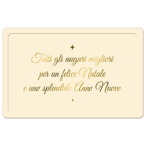 Biglietti augurali natalizi a vassoio a due ante (un biglietto normale piegato in modo da poterlo chiudere ma con lo stesso cartoncino del vassoio semplice) cm 9x14 con busta in tinta - cartoncino di colore avorio con scritte differenti in oro metallizzato, ideali per augurare un sereno Natale. La stampa della scritta è in copertina mentre l?interno è vuoto. In confezione da 6 biglietti.