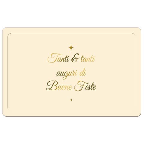 Biglietti augurali natalizi a vassoio (cartoncino singolo pregiato con cornice a sbalzo) cm 9x14 con busta in tinta - cartoncino di colore avorio con scritte differenti in oro metallizzato, ideali per augurare un sereno Natale. In confezione da 6 biglietti.