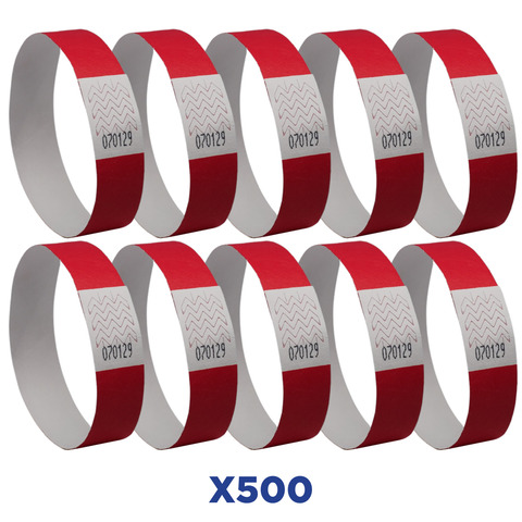Braccialetti identificativi realizzati in Tyvek®, materiale composto da fibre di polietilene ad altà densità (HDPE). Perfetti per eventi pubblici e sportivi. Il materiale resistente, morbido e antistrappo li rende un accessorio indispensabile per identificare i partecipanti agli eventi. Resistono all'acqua e agli strappi. Sistema di chiusura adesivo adattabile a tutte le taglie di polso. Disponibili in diversi colori per diversificare i partecipanti agli eventi. Colore rosso fluo. Confezione composta da 500 pezzi.