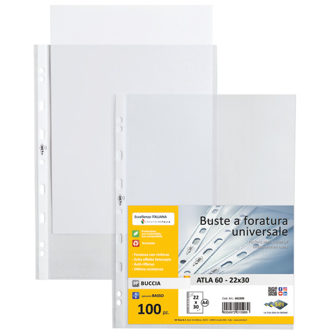 Busta trasparente realizzata in PP a buccia d'arancia con basso spessore e a foratura universale rinforzata. Ideali per archiviare qualsiasi tipo di documento. Formato 22 x 30 cm. Confezione composta da 100 pezzi.