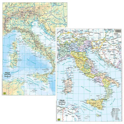 La cartografia dell?Italia è basata sulla proiezione conforme di Gauss-Boaga e rappresenta l?aspetto fisico dell?Italia da un lato e quello politico dall?altro. Il taglio comprende l?intero bacino dell?Adriatico. Nel lato con la parte fisica emerge la conformazione dei sistemi montuosi e dei fondali marini grazie a una scala di colori armonica che non disturba la leggibilità. La toponomastica, oltre a definire i principali elementi geografici, cura in particolare la delimitazione delle catene montuose con i relativi passi e si estende agli specchi d?acqua e alle regioni fisiche minori. Il lato con la versione politica è ricco di colori brillanti nel rispetto dell?armonia estetica e della leggibilità. All?interno delle regioni si distinguono le province con i rispettivi capoluoghi. Le città si distinguono per grandezza con una simbologia appropriata. In entrambe le versioni è curata la dizione italiana dei toponimi esteri e l?uso degli accenti è esteso alle parole sdrùcciole. Plastificata per fornire la massima protezione, è economica e duratura, ideata specificatamente per l?uso nelle scuole. Carta da banco dell'Italia, formato 30 x 42 cm (A3).