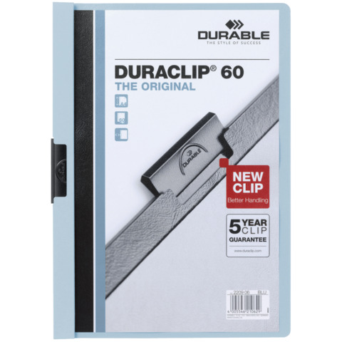 L'originale cartellina con clip inventata e brevettata da DURABLE nel 1959 e prodotta in Germania. Cartellina realizzata in PVC di alta qualità con clip in acciaio, copertina trasparente e retro colorato. La clip si adatta al numero di fogli inseriti e il suo perfetto funzionamento è garantito 5 anni. Ideale per presentare e archiviare, in modo professionale, documenti non perforati: tira la clip - inserisci i documenti - riposiziona la clip - semplice! Con DURACLIP® i tuoi fascicoli avranno sempre un aspetto professionale, ordinato e organizzato. Capacità 1-60 fogli formato A4.