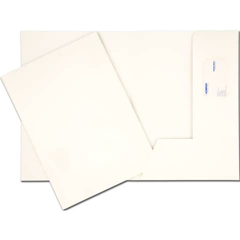 Cartellina a due lembi in bindakote gr. 250, robusta ed elegante, lucida esternamente. Per presentazioni di contratti e preventivi. Alloggio per biglietto da visita. Formato 32x24 cm.