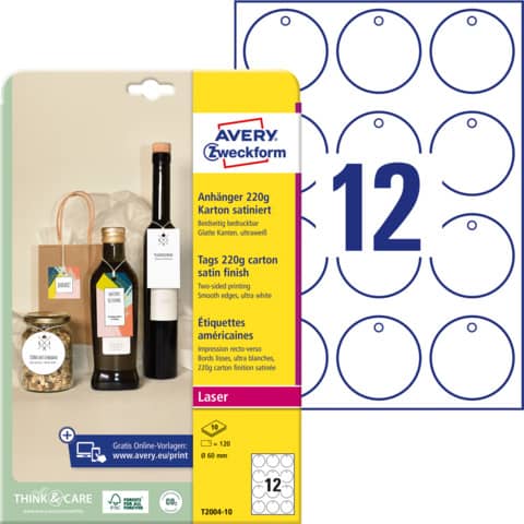 Cartellini in cartoncino rotondo da 220 g con bordi lisci. Formato: Ø60 mm. Utilizzabile su stampante laser e stampabili su due lati. Certificati FSC®. Include il cordoncino. Confezione da 10 fogli ognuno da 12 cartellini, per un totale di 120 cartellini.