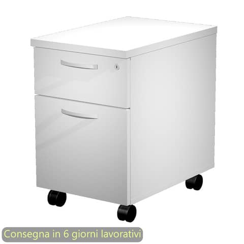 Cassettiera della linea Flex dotata di 1 cassetto con serratura ed 1 ampio classificatore per cartelle sospese con interasse 33 cm. Cassetti scorrevoli su guide metalliche con fermo a fine corsa. Dimensioni L. 44 x P. 60 x H. 60 cm. Cassettiera su ruote pivotanti, montate e con freno, con meccanismo antiribaltamento per un facile e sicuro spostamento. Schiena in tinta con la struttura. Materiale melaminico bilaminato antigraffio ed antiriflesso conforme alle norme UNI e EN classe E1. La cassettiera viene venduta e consegnata montata. Produzione certificata conforme alle procedure UNI EN ISO 9001. Certificazioni FSC e PEFC. Colore bianco.