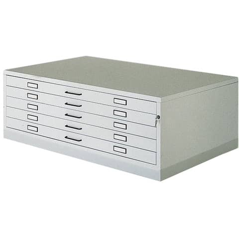 Cassettiera orizzontale realizzata in metallo a 5 cassetti. Con serratura. Completa di top e zoccolo. Formato A1. Apertura cassetti a scorrimento su cuscinetti. Verniciatura epossidica. Altezza interna del cassetto 5,5 cm. Portata massima cassetto 40 kg. Colore bianco (RAL 9016). Disponibili altri colori su richiesta (RAL 7035/RAL 9005). Dimensioni: 113 x 79,5 x 55 cm. Peso netto: 80 Kg. Peso con gabbia: 102 Kg. Misure cassetti: 103 x 73 x 5,5 cm.