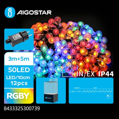 Catena luminosa con lampadine a sfera a basso voltaggio 50 led. Utilizzo ideale come luci di Natale, luci per decorare giardini, feste, aree campeggio...non c'è limite agli utilizzi delle catene luminose. Lunghezza: 3m+5m. Utilizzo IN+OUT. 10cm/LED. N°8 modalità di illuminazione + memoria + timer. Multicolore: luce rossa, verde, blu e gialla. Lampadine tonde trasparenti. Potenza: 3,6W. DC: 31V. IP44.