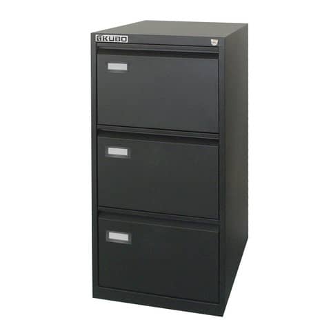 Classificatore in metallo di spessore KUBO 0,9 mm. (struttura) e 0,7 mm. (cassetti). Robusto e sicuro, con maniglia ergonomica e sistema antiribaltamento che impedisce l'apertura simultanea di più cassetti. Modello a 3 cassetti - colore nero. Portata max. di ciascun cassetto 30 Kg.; sistema di chiusura centralizzato con 2 chiavi in dotazione e porta etichette in plastica posizionato su ogni cassetto. Dotati di guide telescopiche ad estrazione totale, i cassetti scorrono con estrema facilità e silenziosità. Cassetti adatti a contenere cartelle sospese con interasse 38 cm., 39 cm e 33 cm (tramite barra supplementare inclusa). Verniciatura con polveri epossidiche. Rispondono alle norme europee di sicurezza e sono dotati di marchio TÜV - GS. Garanzia 5 anni per vizi di fabbricazione (cassetti testati per 80.000 cicli di apertura/chiusura). Consegnati montati con imballo molto resistente su singoli pallet.