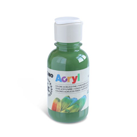 Colore acrilico ad acqua ad alta concentrazione di pigmento di emulsione acrilica, di alta qualità, opaco e molto coprente che una volta asciutto è permanente. Si stende facilmente e asciuga in bella superficie rimanendo elastico, di tono vivo e luminoso, piacevole al tatto e resistente. Bottiglia in PET dotata di tappo dosatore. Colore verde oliva, formato 125 ml.