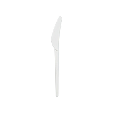 Coltelli in CPLA in busta biodegradabile e compostabile in PLA. Lunghezza: 165 mm. Peso: 3,8 grammi. Contenuto per confezione: 100 pezzi. Temperatura di esercizio: da -18 °C a +80 °C. Utilizzabile in freezer a basse temperature. Certificazioni: TUV INDUSTRIAL - DIN CERTCO. Prodotto PFAS free. Colore: bianco.