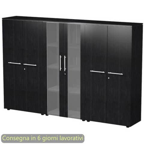 Composizione tre armadi medio/alti. Mobile centrale con ante vetro e serratura. Mobili laterali con 2 coppie di ante in melaminico. Colore: nero venato frassimo. Top e fianchi finitura spessore 14 mm. Dimensioni: 162,8x43xH.158,2 cm. Produzione interna Artexport della parte in legno certificata Iso 9001. Certificazioni FSC e PEFC. Imballi totalmente in cartone per un facile riciclo, a basso impatto ambientale.