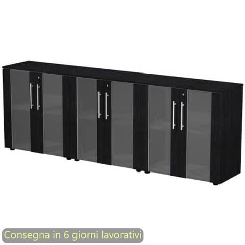 Composizione da tre armadi bassi con tre coppie di ante vetro/melaminico con serratura. Top e fianchi di finitura con spessore 14 mm. Colore: nero venato frassino. Dimensioni: 242,8x43xH.81,4 cm. Produzione interna Artexport della parte in legno certificata Iso 9001. Certificazioni FSC e PEFC. Imballi totalmente in cartone per un facile riciclo, a basso impatto ambientale.