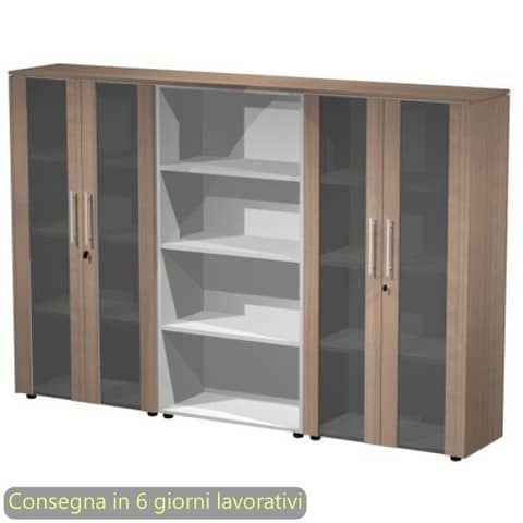 Composizione di tre armadi medio/alti. Mobile centrale a giorno e mobili laterali con due coppie di ante vetro/melaminico con serratura. Top e fianchi finitura spessore 14 mm. Colore: ciliegio arabis. Dimensioni: 162,8x43xH.158,2 cm. Produzione interna Artexport della parte in legno certificata Iso 9001. Certificazioni FSC e PEFC. Imballi totalmente in cartone per un facile riciclo, a basso impatto ambientale.