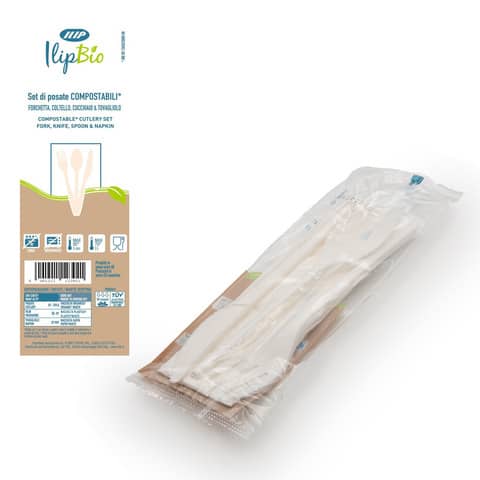 Conf. 200 set da 3 posate bianche coltello + forchetta + cucchiaio con tovagliolo in PLA BIO IlipBio 81004