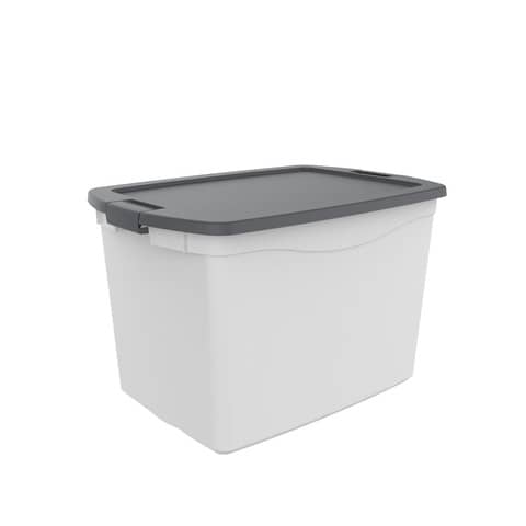 Contenitore realizzato al 100% con plastica riciclata. Capacità 80L, dotato di chiusura con coperchio con clip e pratiche impugnature laterali per un facile trasporto. Contenitore impilabile colorazione grigio chiaro/scuro.