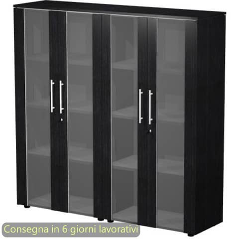 Coppia armadi medio-alti con top, fianchi finitura ed ante vetro e melaminico con serratura. Colore: nero venato frassino. Top e fianchi di finitura con spessore 14 mm. Dimensioni: 162,8x43xH.158,2 cm. Produzione interna Artexport della parte in legno certificata Iso 9001. Certificazioni FSC e PEFC. Imballi totalmente in cartone per un facile riciclo, a basso impatto ambientale.