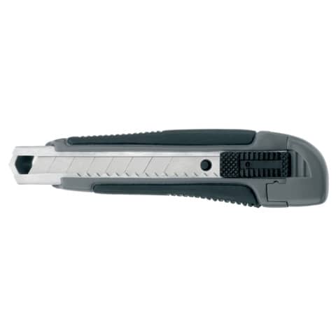 Il Cutter Premium ha un leggero corpo in plastica. Da evidenziare in modo particolare è la guida della lama in metallo. Il sistema automatico di incastro serve a garantire la sicurezza durante il taglio. Inoltre dispone di un cappuccio terminale rimovibile per spezzare le lame utilizzate. Certificazione TÜV. Garanzia di 3 anni. Guida della lama in metallo, larghezza lama 18 mm, grigio/nero.