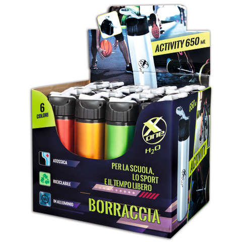 Borraccia in alluminio, 650 ml. Ideale per lo sport, la scuola ed il tempo libero. Moschettone con beccuccio a chiusura sicura. 99,7% in puro alluminio. Pratica leggera e senza piombo o altre sostanze dannose. Riciclabile al 100%. Certificata e disponibile in 6 colori assortiti. Display da 12 pezzi.