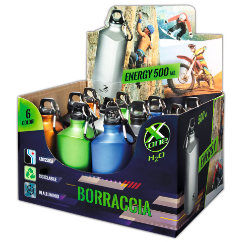 Borraccia in alluminio, 500 ml. Ideale per lo sport, la scuola ed il tempo libero. Forma triangolare, pratica e leggera. Con moschettone removibile per l?aggancio. 99,7% in puro alluminio. Atossica, adatta per alimenti. Senza piombo o altre sostanze dannose. Riciclabile al 100%. Certificata. 6 colori assortiti. Espositore da 12 pezzi.