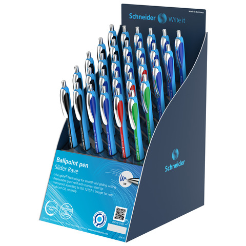Espositore 30 penne a sfera a scatto ricaricabili Schneider Slider Rave tratto XB – 4 colori assortiti – P304022