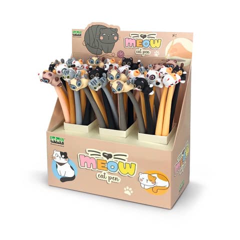 Espositore da banco composto da 36 penne con cappuccio Flexy Meow Cat Pen e fusto flessibile. Disponibili in 6 soggetti assortiti.