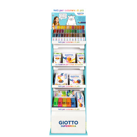 Espositore Giotto, dimensioni: 209 x 44 x 50 cm. Contenuto: Giotto Supermina monocolore - assortimenti di nr. 34 colori; NEW - F073400 - Giotto Turbocolor in astuccio da 18 colori - nr. 14 pezzi; Giotto Supermina astuccio da 12 colori - nr. 20 pezzi (F235700); Giotto SuperMina astuccio da 18 colori + 2 Matite Lyra Temagraph - nr. 15 pezzi (F23630000); Giotto SuperMina astuccio da 24 colori - nr. 15 pezzi (F235800); Giotto SuperMina astuccio da 36 colori - nr. 5 pezzi (F235900); Giotto Temperamatite 3in1 - nr. 30 pezzi (F232100).