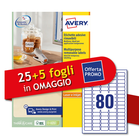 Etichette bianche rimovibili laser/inkjet. Dimensioni: 35,6 x 16,9 mm. N°80 etichette per foglio. Confezione da 25+5 fogli OMAGGIO.