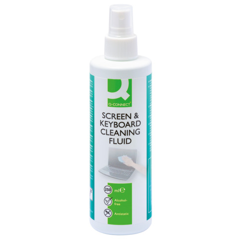 Fluido detergente Q-Connect per schermo e tastiera. Liquido antistatico che aiuta a ridurre la polvere per uno schermo brillante. Contiene battericida. 250ml.
