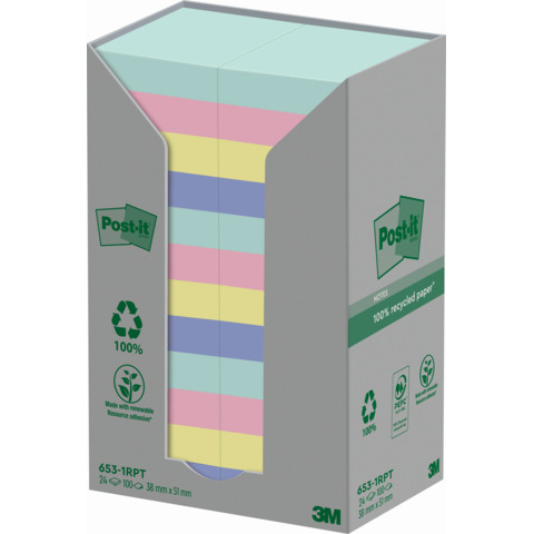 Foglietti Post-it® Notes in carta riciclata assortiti pastello conf. Torre da 24 blocchetti da 100 ff – 653-1RPTN