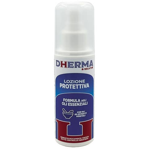 Dherma & Salutae Lozione corpo protettiva con formula agli oli essenziali. Prodotto naturale senza sostanze insetticide, adatto anche ai bambini e testato sotto controllo pediatrico. La sua formulazione specifica con oli ed estratti vegetali sfrutta le proprietà degli oli essenziali. Spray no-gas 75 ml. Lozione indicata per la protezione della pelle e la prevenzione delle punture di insetto. Modalità d'uso: vaporizzare delicatamente sulle parti scoperte, come viso, collo, braccia, gambe. Il prodotto non macchia ed è a rapido assorbimento. Una volta applicato lascia sulla cute un sottile strato protettivo che aiuta ad allontanare gli insetti.