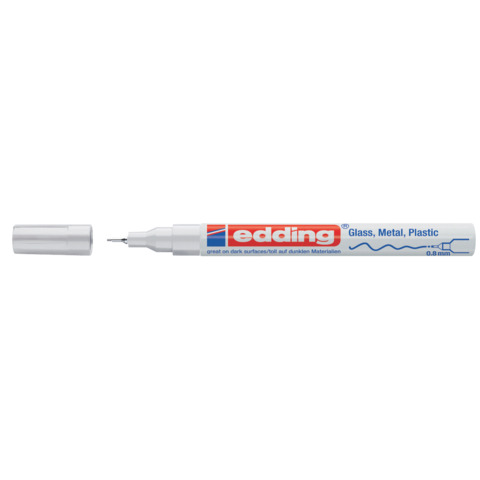 Marcatore a vernice lucida ideale per scrivere e abbellire in modo altamente coprente e permanente, senza sbavature. Scrive su materiali: lisci, anche scuri e trasparenti, quali metallo, vetro, plastica e carta rivestita, La punta sintetica con guaina metallica ha un tratto di 0,8 mm. L'inchiostro pigmentato simile alla vernice è ad asciugatura rapida, resistente alle intemperie, estremamente resistente alla luce e all'usura. Disponibili punte di ricambio edding 780. L'inchiostro è inodore e senza aggiunta di tolueane/xylene. Dotato di fusto in alluminio resistente. Colore bianco.