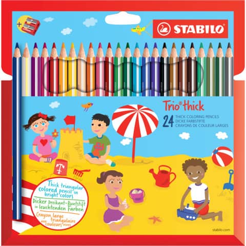 STABILO Trio thick sono matite colorate ergonomiche con fusto grosso, triangolare ed ergonomico per un'impugnatura rilassata. STABILO Trio thick sono studiate appositamente per non affaticare la mano ed imparare a colorare con la corretta impugnatura. Grazie alla ricca applicazione di colore e all'ampiezza del tratto di 4,2 mm sono ideali per i piccoli artisti che esprimono tutta la loro creatività con i colori.
