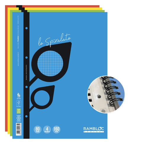 RAMBLOC - Quaderno spiralato con lato lungo forato (4 fori) e rinforzato - 80 fogli bianchi - 4 mm - Copertina colorata in 4 colori differenti. Certificato FSC.
