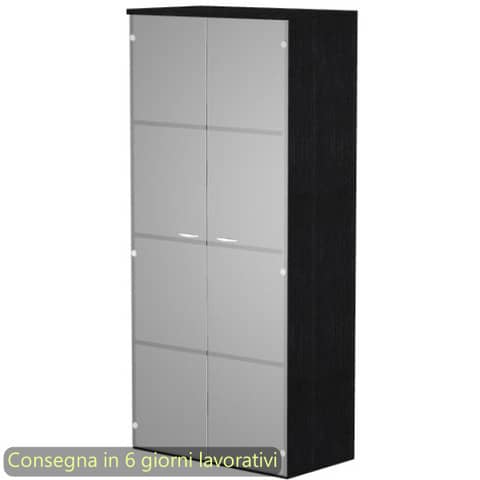 Mobile alto della linea Presto, una linea operativa contemporanea progettata per un utilizzo quotidiano ed intensivo in grado di soddisfare tutte le esigenze funzionali ed estetiche. La gamma completa degli elementi permette di allestire ogni ambiente di lavoro, personalizzandolo con stile. Scrivanie con dimensioni conformi alle normative sulla sicurezza dei posti di lavoro in ufficio. Dimensioni L. 80 x P. 35 x H. 180 cm. Top sp. 22 mm. Struttura, ante e ripiani sp. 18 mm. Tre ripiani regolabili in altezza con un sistema di bloccaggio nella posizione desiderata. Ante in vetro satinato senza serratura. Il mobile, rifinito posteriormente nello stesso colore della struttura, può essere utilizzato come parete divisoria. Dotato di piedini regolabili in altezza per un perfetto livellamento sul pavimento. Imballi in cartone riciclato alto spessore a tutela dell?ambiente. Produzione certificata conforme alle procedure UNI EN ISO 9001. Certificazioni FSC e PEFC. Struttura nero venato frassino.
