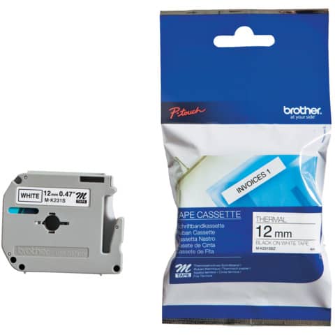 Nastro per etichettarice, formato 12mm x 8mt, colore nero/bianco. Ideali per tutti gli usi, compatibili con tutte le etichettatrici Brother P-touch che riportano il logo M sul coperchio della cassetta.