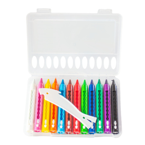 Pastelli a cera acquerellabili. Hanno 12 colori accesi e brillanti che consentono molteplici e originali risultati creativi, basta passare un pennello inumidito sulle aree colorate. Disponibili in astuccio appendibile trasparente realizzato in PP composto da 12 pezzi con raschietto per gesso. Assortimento colori: bianco, rosa, giallo, arancione, azzurro, marrone, rosso, verde, blu, verde scuro, porpora e nero. Dimensioni pastello a cera: 9,8 x 1,2 cm. Dotati di manicotto scorrevole.
