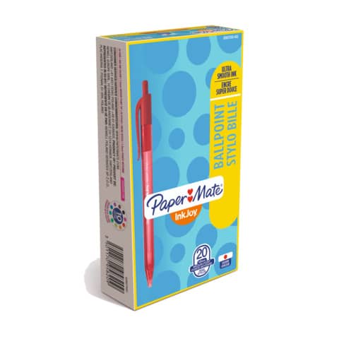 Papermate InkJoy 100RT a scatto. Inchiostro ad asciugatura rapida, colori accesi ed intensi. Punta media, fusto triangolare per un?impugnatura confortevole, clip da taschino. Colore: rosso.