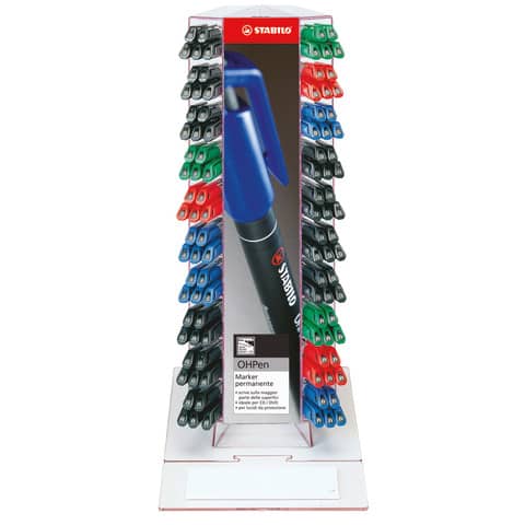 Penna OHPen ideale per lucidi e per quasi tutte le superfici lisce (cd-rom, DVD, plastica, vetro, metallo e ceramica). Impugnatura zigrinata, fondello e cappuccio ventilato con clip nel colore dell'inchiostro. Punta superfine, ampiezza di tratto 0,4 mm. Espositore composto da 150 marcatori, colori assortiti.