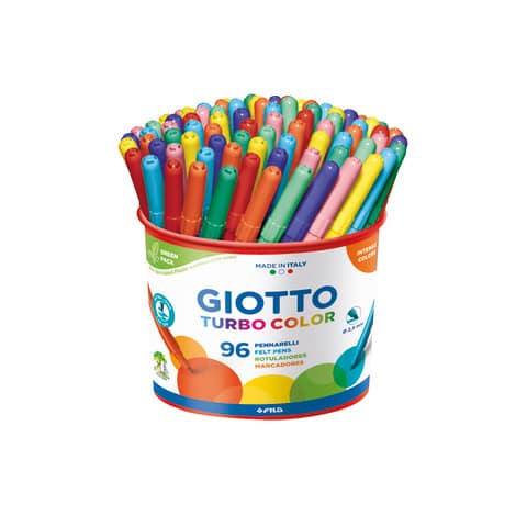 Pennarelli Giotto TURBO COLOR in barattolo da 96 pezzi. Creati con inchiostri innocui e lavabili, sono dotati di una punta fine in fibra super resistente di lunga durata che non rientra mai. Disponibili in 36 colori intensi e brillanti, i pennarelli Giotto TURBO COLOR sono sicuri al 100% grazie al cappuccio ventilato e al tappo di sicurezza. Colore: assortiti.