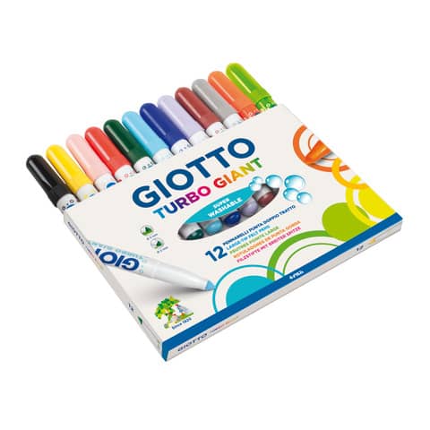 Pennarelli Giotto GIANT super lavabili. Giotto Turbo Giant è il pennarello extra large di ultima generazione con punta conica che permette di realizzare ampie campiture di colore, ma anche di tracciare linee fini se utilizzato in posizione verticale. Colore: assortiti. Confezione: 12 pezzi.