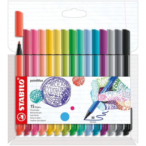 Pennarelli Stabilo PointMax con punta nylon ''M'' da 0.8 mm. Resiste fino a 24 ore senza cappuccio. Inchiostro inodore a base d'acqua. Dotato di comoda clip. Astuccio appendibile con 15 colori: 488/5 - giallo chiaro, 488/7 - corallo, 488/11 - blu ghiaccio, 488/13 - verde ghiaccio, 488/14 - lime, 488/26 - albicocca, 488/29 -rosa chiaro, 488/31 - azzurro chiaro, 488/43 - verde foglia, 488/44 - giallo, 488/46 - nero, 488/49 - rosso fragola, 488/58 - lilla, 488/94 - grigio freddo chiaro, 488/96 - grigio scuro.