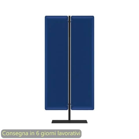 Piantana/divisorio mobile con pannelli fonoassorbenti blu, struttura nero opaco. Linea Woody. Base 60x30 cm. N°2 pannelli 160x40 cm. Dimensioni: L.83,8xH.180 cm. Imballo in cartone riciclato a tutela dell'ambiente. Produzione certificata conforme procedure UNI EN ISO 9001. Pannelli divisori acustici fonoassorbenti certificati. Progettati per aumentare il benessere nell?ambiente di lavoro e per definire aree nelle quali conciliare operatività e privacy. I pannelli sono realizzati in fibra di poliestere termoformata e si compongono di più strati accoppiati di densità variabile con tessuto esterno Mirage. La densità variabile ottenuta attraverso la termoformatura del materiale consente l?assorbimento di un più ampio spettro di lunghezze d?onda, contrariamente a quanto accade con schermi divisori tradizionali. Per creare un buon ambiente acustico è infatti fondamentale garantire tre caratteristiche: assorbimento, diffusione e attenuazione. Moody, con le sue proprietà, incide su questi tre fronti, riuscendo a garantire un ambiente sonoro equilibrato. Gli angoli arrotondati dei pannelli ne addolciscono le forme ed eliminano gli spigoli pericolosi in caso di urto accidentale. I pannelli sono un prodotto ecologico perché ottenuti da materiale riciclato e a sua volta riciclabile.