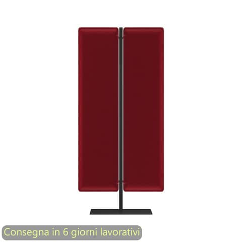 Piantana/divisorio mobile con pannelli fonoassorbenti rossi, struttura nero opaco. Linea Woody. Base 60x30 cm. N°2 pannelli 120x40 cm. Dimensioni: L.83,8xH.140 cm. Imballo in cartone riciclato a tutela dell'ambiente. Produzione certificata conforme procedure UNI EN ISO 9001. Pannelli divisori acustici fonoassorbenti certificati. Progettati per aumentare il benessere nell?ambiente di lavoro e per definire aree nelle quali conciliare operatività e privacy. I pannelli sono realizzati in fibra di poliestere termoformata e si compongono di più strati accoppiati di densità variabile con tessuto esterno Mirage. La densità variabile ottenuta attraverso la termoformatura del materiale consente l?assorbimento di un più ampio spettro di lunghezze d?onda, contrariamente a quanto accade con schermi divisori tradizionali. Per creare un buon ambiente acustico è infatti fondamentale garantire tre caratteristiche: assorbimento, diffusione e attenuazione. Moody, con le sue proprietà, incide su questi tre fronti, riuscendo a garantire un ambiente sonoro equilibrato. Gli angoli arrotondati dei pannelli ne addolciscono le forme ed eliminano gli spigoli pericolosi in caso di urto accidentale. I pannelli sono un prodotto ecologico perché ottenuti da materiale riciclato e a sua volta riciclabile.