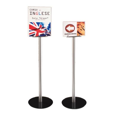 Porta segnaletica da pavimento su piantana, della serie Menu Board. Porta avvisi in acrilico formato A4 per posizionamento sia in verticale che in orizzontale. Struttura in alluminio e base in acciaio. Ø: 32 cm. Dimensioni: 126x21 cm. Peso netto: 6 Kg. Peso lordo: 7 Kg.