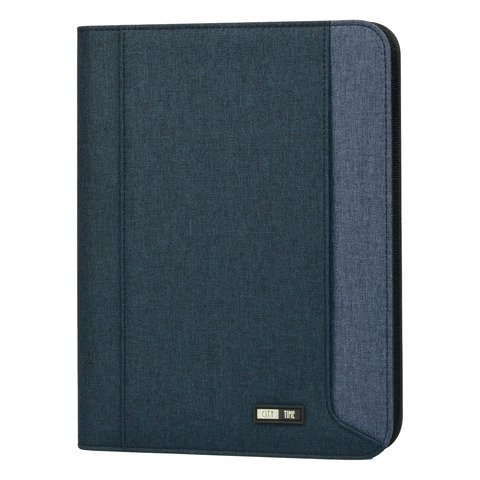 Portablocco A4 linea DUAL bicolore in tessuto tecnico, chiusura con zip, scomparti per biglietti, tasca interna portadocumenti, portapenna, completo di blocco. Dimensioni 26 x 34 cm. Colore blu.