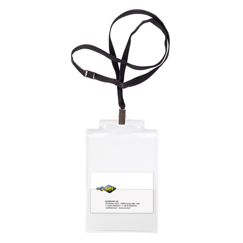 Portanomi in PVC rigido trasparente di altissimo spessore, con rinforzo colorato. Tasca accessoria portabiglietti da visita, cards, banconote, etc. Dotati di asola centrale per la pinzetta e fori laterali per i moschettoni. Apertura in alto. Adatti a fiere, congressi, convegni, eventi sportivi, etc. Formato: 10x15 cm. Colore tasca neutro. Colore cordoncino nero.